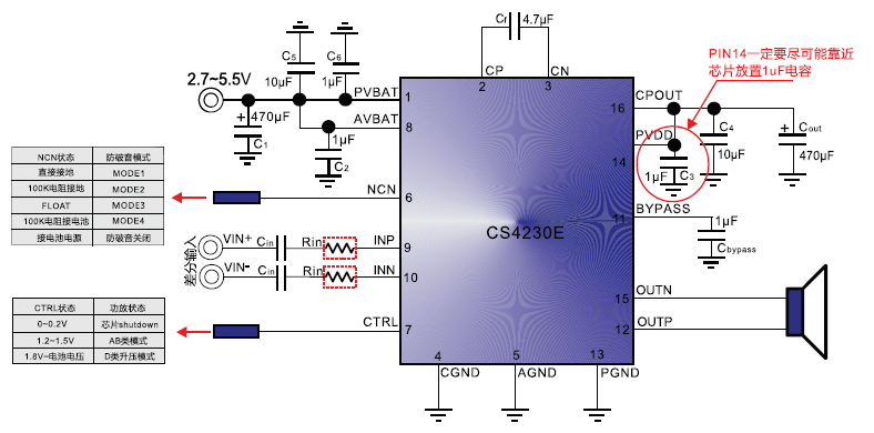 概要CS4230E是一款采用 CMOS工藝 ,電窯式升壓型 GF類單 聲道音頻功放,可以為4Ω的負載O供最高4.8W的連續功 率;CS4230E芯片內部固定的28倍增益,有效的減少了 外圍元器件的數量;功放集成了D類和AB類兩種工作模式 即可保證D類模式下強勁的功率輸出,又可兼顧系統在有 FM的情況下,消除功放對系統的干擾;CS4230E具有獨 特的防破音(NCN)功 能,可根據輸出信號的大小自動調整 功放的增益,實現更 舒適的昕覺感受,其4種防破音模式 的選擇為不同的工程要求O供了最大的挑選余地 ;另 外,CS4230E還具備電源自適應能力,當電源電壓低的時 候,功放會自動降低增益,從而減少功放的輸出功率.CS4230E的外圍只有低成本的阻窯器件,在以徨電池供電 的移動式音頻設備中,CS4230E是理想的音頻子系統的功 放解決方案.CS4230E的全差分架構和極高的PSRR有效地提 高了CS4230E對RF噪聲的能力 。另外CS4230E內置了過流保護,短路保護和過熱保護,有效的保護芯片在異常的工作條件下不被損壞。CS4230E供了ESOP16的封裝類型,真額定的工作溫度范圍為-40℃至85℃。特征集成Charge Pump升壓模塊,集成AB類D類兩種工作模式GF類音頻功放先進的電源自適應功能,輸出功率Po at 10% THD+N, VBAT = 4.2VRL = 4 Ω+33μH 4.8W(NCN OFF@D MODE)Po at 1% THD+N, VBAT = 4.2VRL = 4 Ω+33μH 4.0W(NCN OFF@D MODE)輸入電壓范圍:2.7~5.5V關斷電流:<1μA待機電流: 3mAD類調E頻率: 300KHz4種防破音模式可選AERC專利M術,O供優異的全帶寬EMIDE能力優異的"嚼莫-咔暗"(pop-noise)雜音DE能力高的電源DE比(PSRR):在217Hz下為-80dB過溫保護過壓保護封裝ESOP16L應用藍牙音箱 便攜式音頻設備 管腳定義及說明